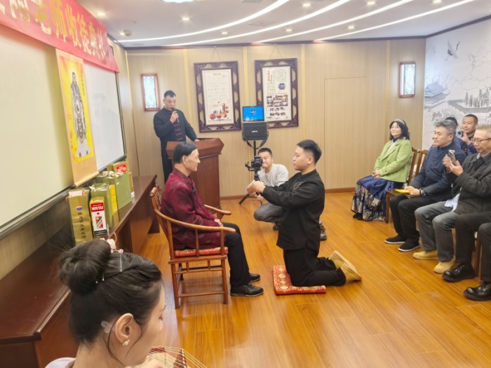 “生我者父母,教我者师父。”拜师,是学子步入学问殿堂最庄严的一步。 典礼庄重推进至核心环节:敬呈拜师帖。弟子承熹、承均依次上前,双手恭敬地将承载着万千敬师之情、向道之心的拜师