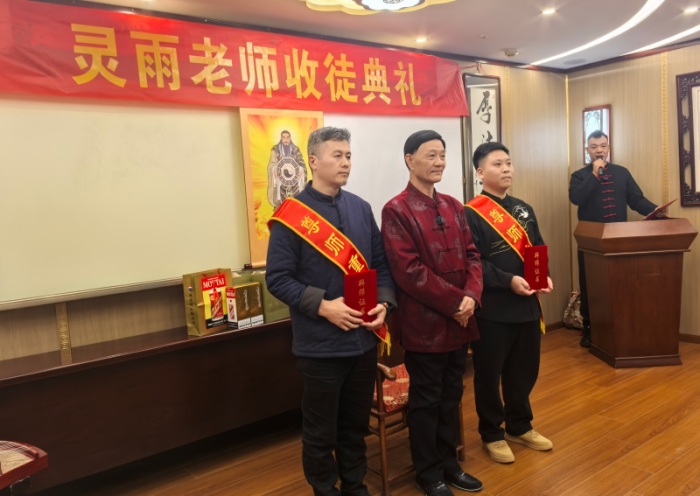 一叩首:“师者尊崇,立人立德。” 再叩首:“传道授业,教化解惑。” 三叩首:“感念师恩,众朋为鉴,天地为鉴。” 每一叩首,都是对师道的永恒承诺。灵雨老师郑重回赐“纳徒帖”,师徒名分于此正式确立。
